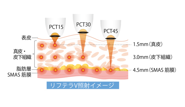 リフテラV(Liftera-V)(イージーハイフ)はムービングHIFUによる最新のタイトニング治療です。リフテラV(イージーハイフ)は10Hzのムービング照射でターゲット層に対し十分な熱拡散を与えます。表皮にダメージを与えることなく強い熱刺激を1.5mm、3.0mm、4.5mmの真皮からSMAS層に対しエネルギーを効率的に伝達させます。ピークパワーの高い超音波により集束点で高いエネルギー密度を生みだし、周りの皮膚組織への過剰なダメージと患者の痛みを最小限にとどめます。